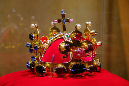 Karlstejn, Czech Republic, 12 March 2022: medieval gothic castle interior, replica of the gold Bohemian royal crown of Saint Wenceslas jewels decorated with precious stones and pearls, old stronghold