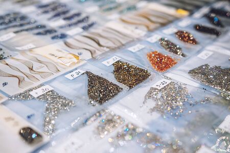 Rhinestone background. Mix of Shiny rhinestones crystals texture as backdrop isolated white studio photo.