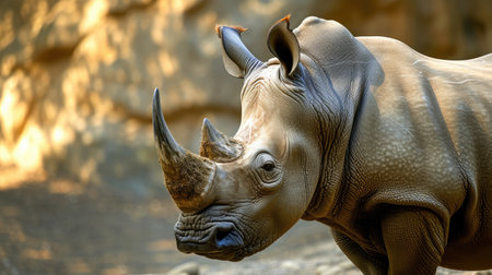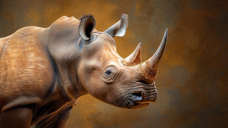 Close-up portrait of a majestic rhino showcasing its impressive horn and strong features set against a warm, textured background, highlighting wildlife beauty.