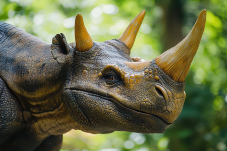 A lifelike dinosaur model with prominent horns is surrounded by vibrant green foliage under soft natural light creating a prehistoric atmosphere.