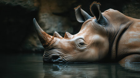 Close-up of tranquil rhinoceros half-submerged in calm water. AI-generated.