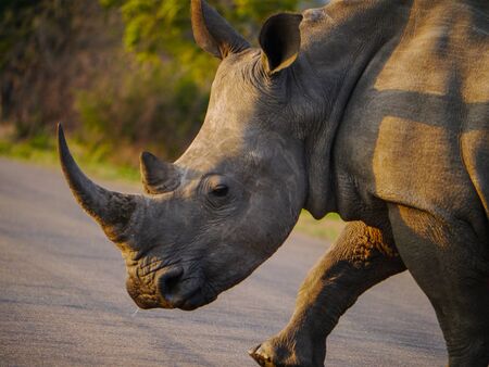 Close-up of a white (or square-lipped) rhinoceros (Ceratotherium simum) crossing across the street in Kruger Nationalpark
