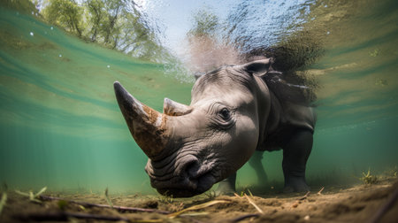 an african rhino gracefully swims in the water, showcasing surrealistic elements and bold chromaticity. this straight photography captures the powerful facial expression of the rhino, creating a captivating national geographic photo. the image is characterized by a striking contrast between dark white and blue tones, resulting in a high-definition visual experience. ai generated