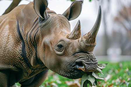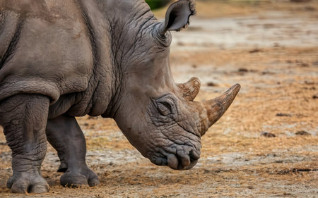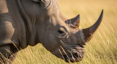 A closeup of an african rhino grazing in the savannah, its powerful horns and thick skin visible as it snatches grass. documentary photography, photography