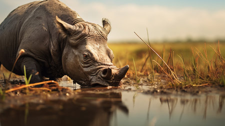 rhino drinking water in the marshes of western red rhinos, captured in the style of joel robison. this 8k frontal perspective photo showcases naturalistic portraiture, making it an eye-catching and explosive wildlife shot. it's no wonder this image was a contest winner. ai generated