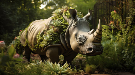 an artificial rhino sculpture, made entirely of vibrant green flowers, stands majestically in a woodland setting. this nature-inspired piece resembles a tranquil gardenscape and would be a stunning addition to any national geographic photo collection. the sharp, prickly details of the sculpture are beautifully captured in this 32k uhd image, creating a solarizing masterpiece. ai generated