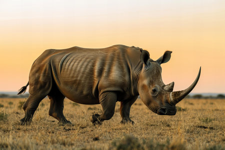 Depicting a white rhino walks across the savannah at sunset, with its long horn and powerful body visible against the backdrop of an orange sky. the grassy landscape is brown in color, creating contrast between it and the animal's black skin.