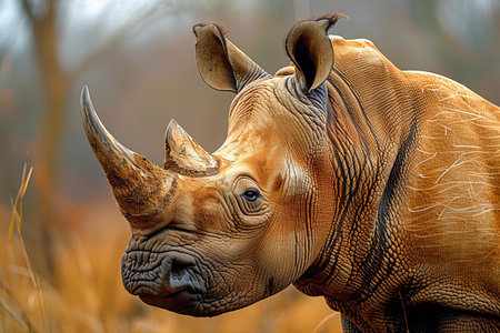 A profile view of an african rhino standing in the savannah, its head turned to one side as it snickles at something off camera. the background is blurred with brown grasses and trees in soft focus. the rhinoceros has large sharp horns that jut out from behind its face, adding character to the scene