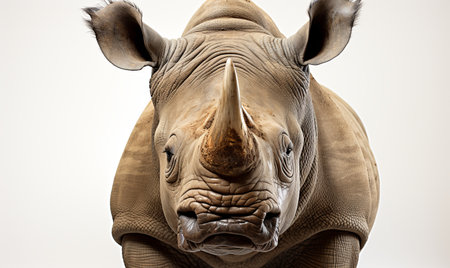 This rhinoceros stands poised with light shadows emphasizing its gray skin texture, set against a clean white background that highlights its natural form.