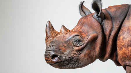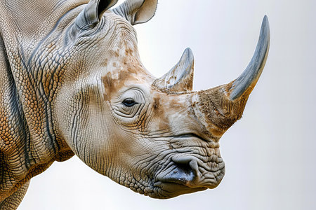 Detailed view of a rhinoceros face, showing its unique features, against a plain white backdrop.