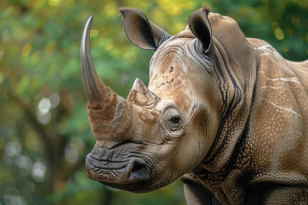 Stunning portrait of a rhinoceros showcasing intricate details of its horn and skin, set against a dramatic backdrop. Perfect for wildlife enthusiasts.
