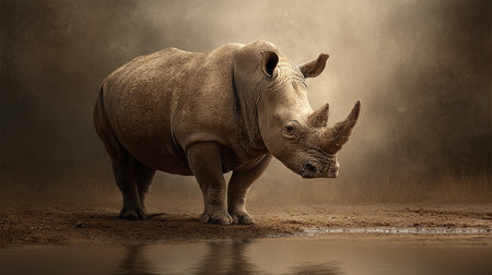 Rhinoceros resting by a pond with soft reflections. AI-generated.