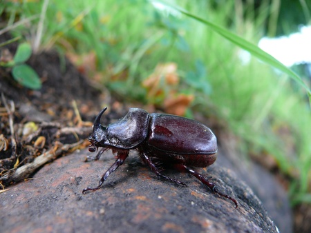 Horned beetle is a pest for coconut farmers, likes to eat coconut flowers so that it can cause crop failure, horns only exist in male beetles, in females there are only small tentacles on his head