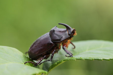 Side view of European Rhinoceros Beetle. Beautiful Oryctes Nasicornis on green leaf