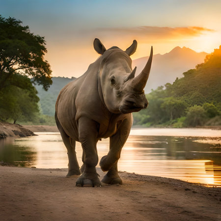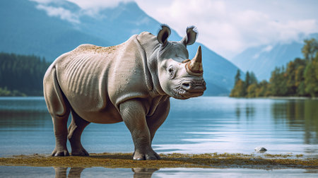 AI Generated. A rhino is standing in front of a body of water