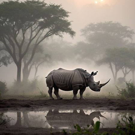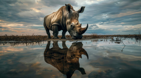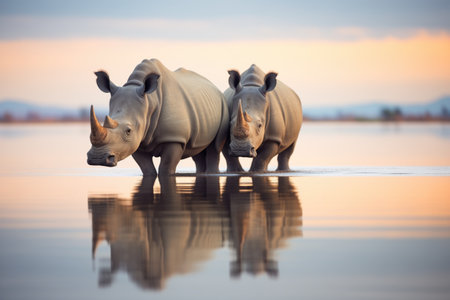 rhinos reflection in calm lake at dusk