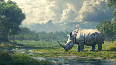 Create an image of a rhino grazing peacefully in a grassland, illustrating the power and resilience of nature --chaos 30 --ar 16:9 --v 6.1 Job ID: d0b2ed97-fdf5-49d5-a688-78f4c70fa00d