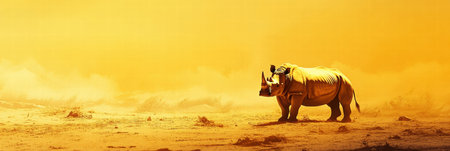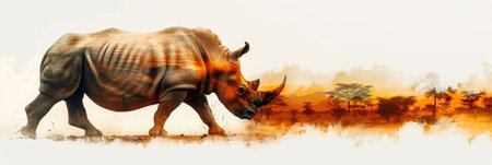 double exposure photograph of a powerful rhinoceros against the rugged and dusty terrain of the African savannah. the unique blend of artistry and nature captured in this stylish composition.