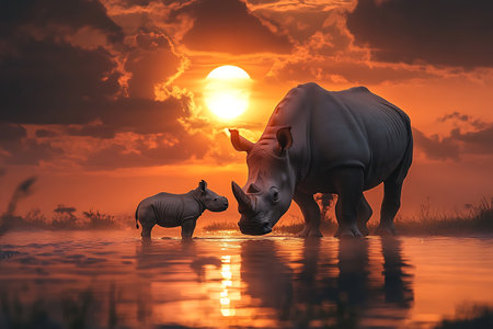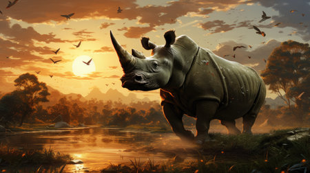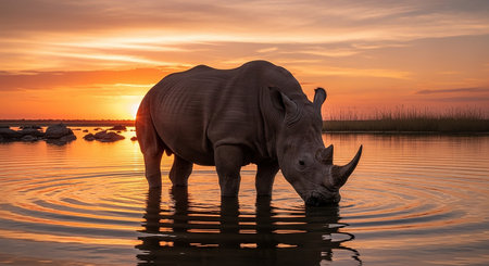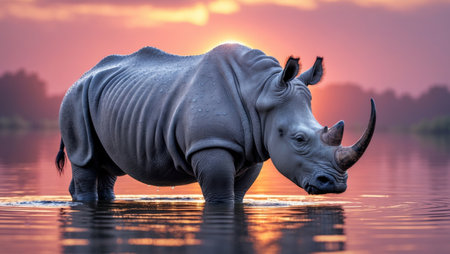 AI Generated. A rhino is standing in a body of water with the sun setting in the background