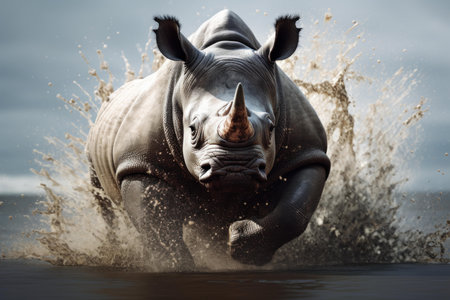 Playful Rhinoceros splashes. Animal horn wild. Generate Ai