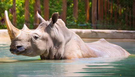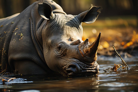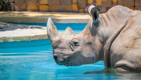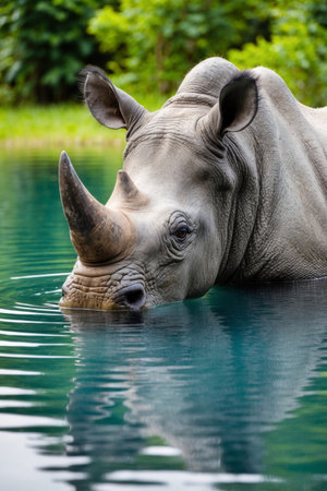 Close-up of tranquil rhinoceros half-submerged in calm water. AI-generated.