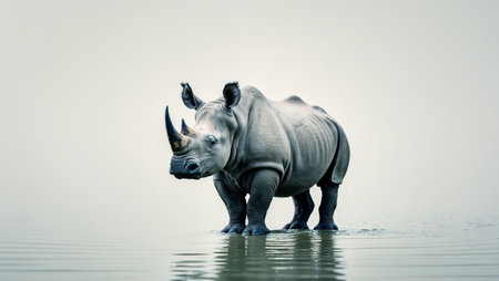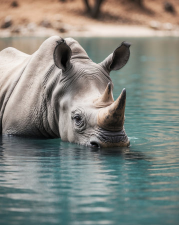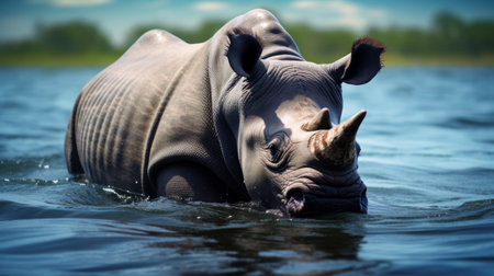 an african rhino gracefully swims in the water, showcasing surrealistic elements and bold chromaticity. this straight photography captures the powerful facial expression of the rhino, creating a captivating national geographic photo. the image is characterized by a striking contrast between dark white and blue tones, resulting in a high-definition visual experience. ai generated