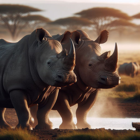 white rhinos are captured in a national geographic photo, showcasing their powerful presence as they stand in water. the realistic hyper-detailed rendering adds an ominous vibe to the scene. with a touch of humor in the caricature-like depiction, the strong facial expressions of these rhinos are brought to life. this art of the congo, created using cryengine, is a captivating portrayal of these magnificent creatures.