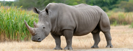 Close-up portrait of a rhino in its natural habitat. Majestic animal with a powerful horn. Wildlife conservation concept.