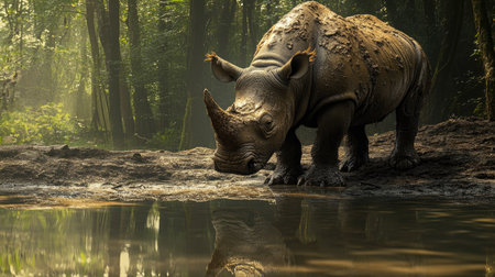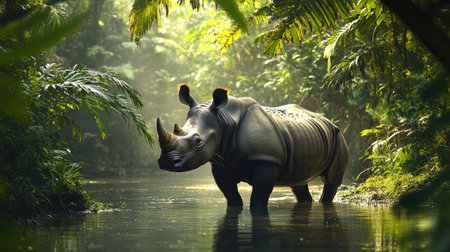 A Javan rhino standing near a watering hole in a lush rainforest, with soft natural lighting.
