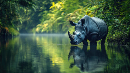 A Javan rhino drinking from a tranquil river, with lush greenery reflected in the water.
