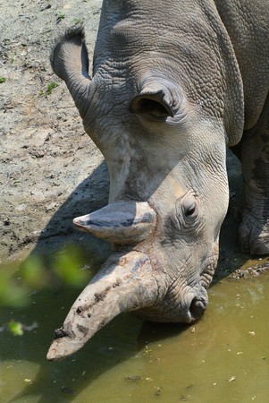 A white rhino, Ceratotherium simum simum, drinking water from a waterhole