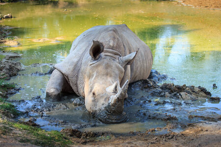 Lazy Rhino lie down in the muddy place, look like it really boring
