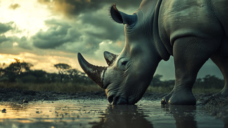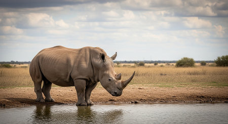 White rhinoceros in savannah landscape, drinking water from pond in african jungle, natural and wilderness abstract art background. Superb Generative AI.