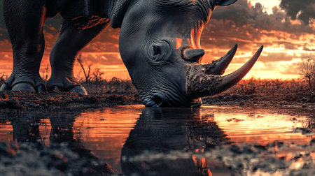 rhino drinking water in the marshes of western red rhinos, captured in the style of joel robison. this 8k frontal perspective photo showcases naturalistic portraiture, making it an eye-catching and explosive wildlife shot. it's no wonder this image was a contest winner. ai generated
