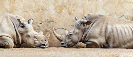 Two white rhinos are resting side by side against a beige wall. The rhinos are facing each other and have their heads down, appearing to be asleep or resting. The ground is covered in light brown sand.