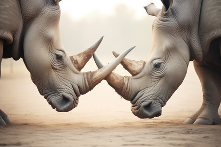 Two Wild Great one-horned rhinoceroses looking at each other face to face. India. Kaziranga National Park.