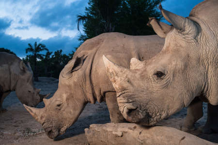 Group of white rhinoceros (Ceratotherium simum) in dust at sunset, South Africa