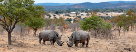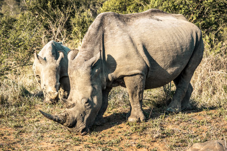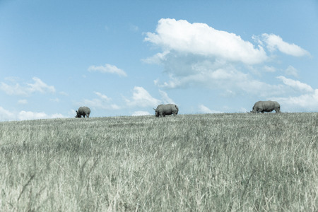 Rhino's on hillside vintage landscape in wildlife wilderness reserve park.