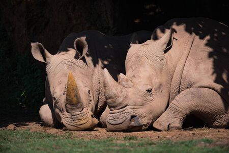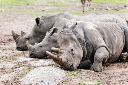 A group of white rhinoceroses (Ceratotherium simum) rest at the Singapore Zoo.