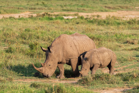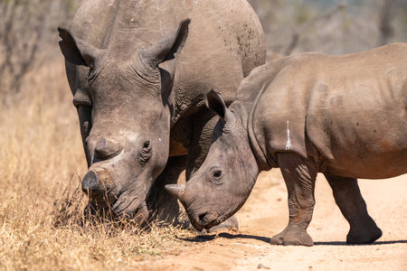 White rhinoceros (Ceratotherium simum) with calf in natural habitat, South Africa