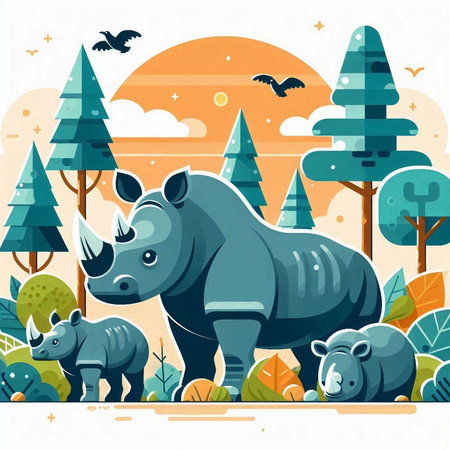 Cute cartoon rhinoceros in the forest. Vector illustration.