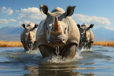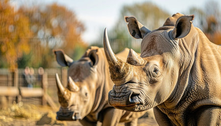 Witness the enchanting beauty of nature as a majestic rhino basks in the tranquil embrace of an autumn landscape Captured in exquisite detail, this wildlife photograph unveils the serene grandeur of nature's remarkable creations The play of shadows and the warmth of autumn hues evoke a sense of peace and wonder, painting a captivating portrait of the harmonious bond between wildlife and its environment AI Generative