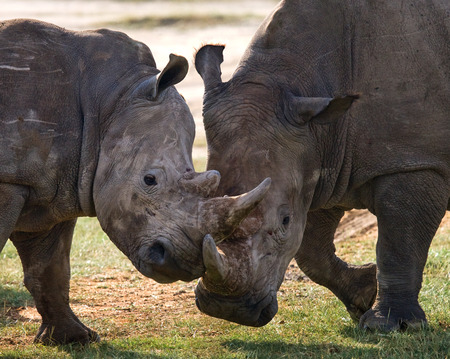 Two rhinoceros fighting with each other. Kenya. National Park. Africa. An excellent illustration.