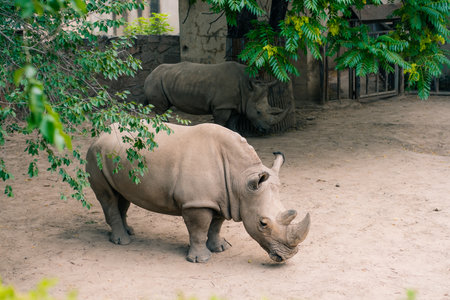 A white rhinoceros stands on a sandy surface, shaded by a leafy tree in a zoo enclosure. The rhinoceros is facing left with its horn visible, and the enclosure features wooden poles and fencing.