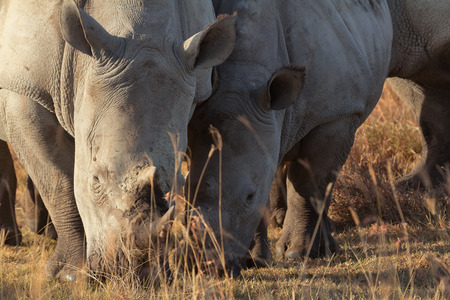 Close up of two white rhinos in Nakuru Park, Kenya during the dry season. Horizontal shot.