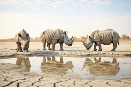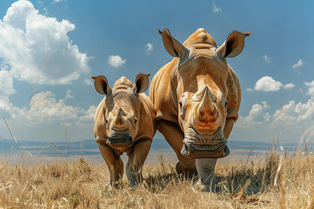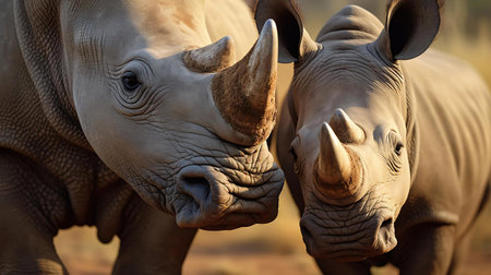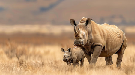 Digital artwork of black rhino with calf in the dry grass of ar niedersch voiden nature protective park, early morning golden hour