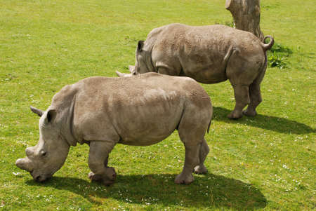 Rhinos, Rhinoceros Grazing in an Open Field in South Africa