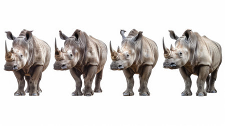 A majestic set of four rhinoceroses isolated on a crisp white background, highlighting the beauty and power of these endangered creatures