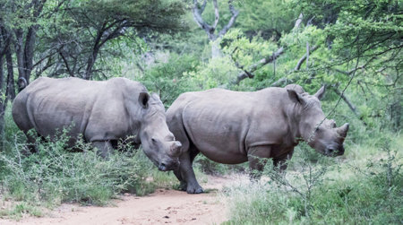Two white rhinoceros stand together on a dusty path in their natural habitat. These terrestrial animals showcase their adaptation to the environment