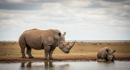 Two white rhinoceros at a waterhole in Chobe National Park, Botswana, Africa